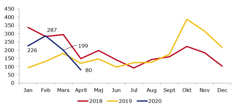 Även i antalet efterlysta personbilar kan man se en viss minskning i landet under mars och april månad jämfört med 2019. Under mars och april månad 2020 har det efterlysts 543 respektive 518 personbilar vilket kan jämföras med 2019 då det efterlystes 570 bilar i mars och 561 bilar i april. Ser man till de bilar som är eftertraktade av internationella brottsnätverk kan man se en tendens att dessa nätverk inte längre är lika aktiva.