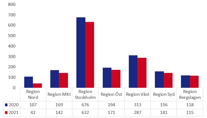 Diagrammet visar antalet polisanmälda båtmotorstölder under 2021 fördelat på region.