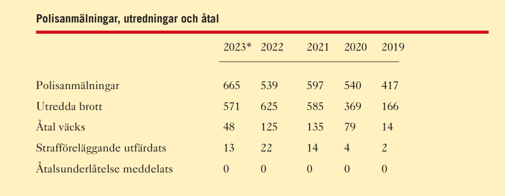 *Årsstatistiken i tabellen ovan presenteras av Brå i maj månad vilket innebär att siffror för 2024 inte finns när denna rapport publiceras i februari månad.